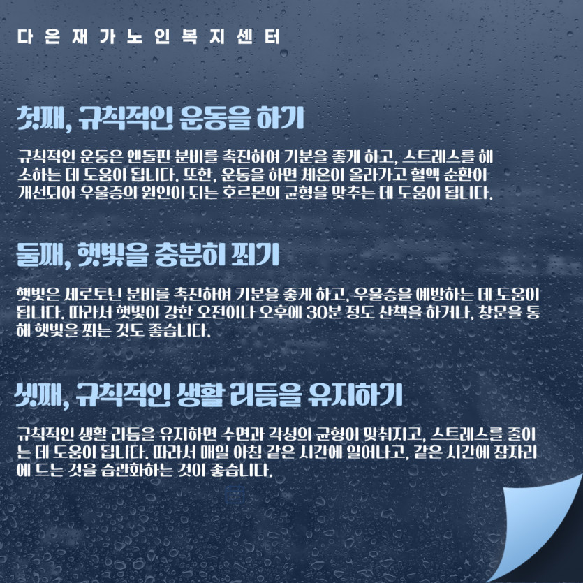 이외에도, 건강한 식단을 챙기고, 충분한 휴식을 취하고, 사회적 관계를 유지하는 것도 우울증을 예방하는 데 도움이 됩니다.