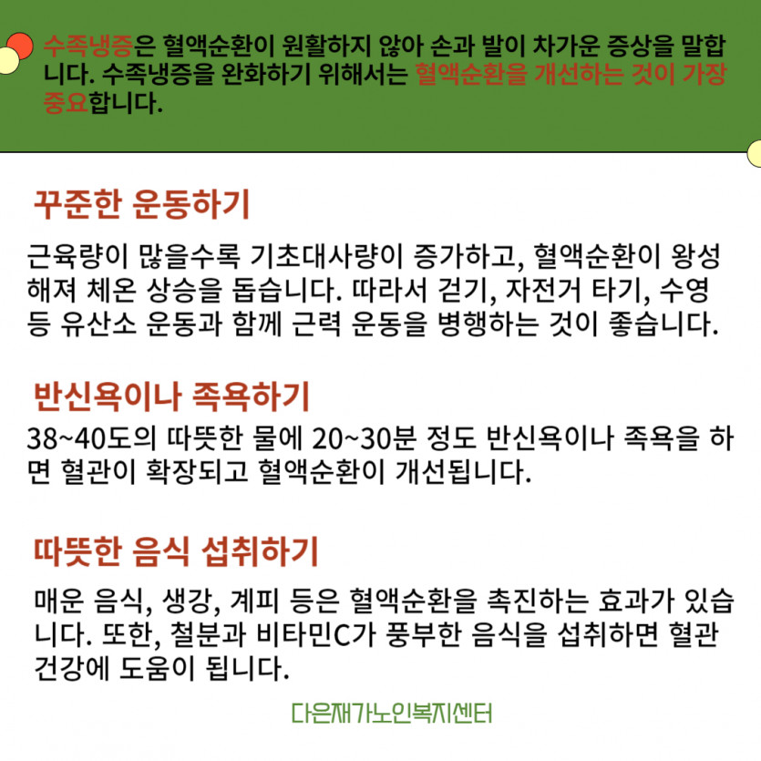 수족냉증이 심하거나 일상생활에 불편을 초래한다면 병원을 찾아 원인을 진단받고 적절한 치료를 받는 것이 좋습니다.