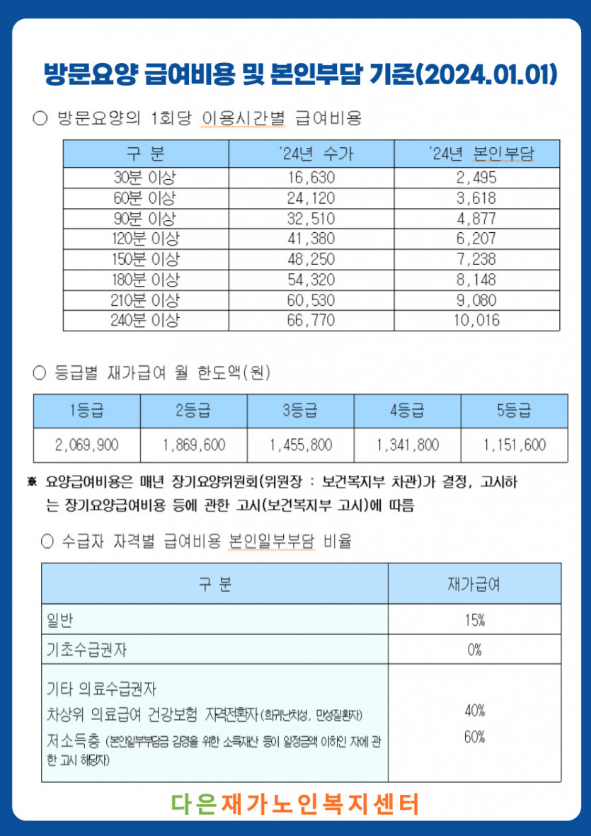 2024년 방문용양 급여비용 및 본인부담금에 대한 상세 금액 안내 드립니다.