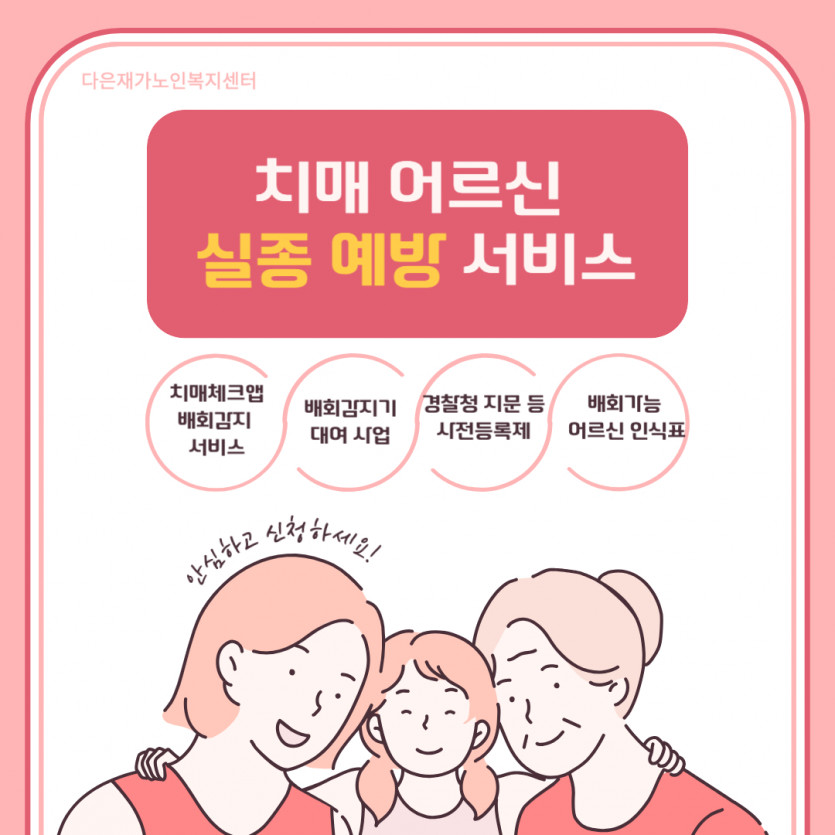 치매 어르신 실종 예방 서비스 페이지 정보 작성자 최고관리자 작성일 24-05-07 17:20 조회 184회 댓글 0건 본문 자세한 내용은 아래 블로그를 통해 확인해 주세요.^^https://blog.naver.com/jejudaeun88/223439119858 이전글여름철 어르신 건강관리를 위한 4가지 체크사항 다음글집으로 찾아가는 장기요양 재택의료 서비스 목록 댓글목록 0 댓글목록 등록된 댓글이 없습니다.